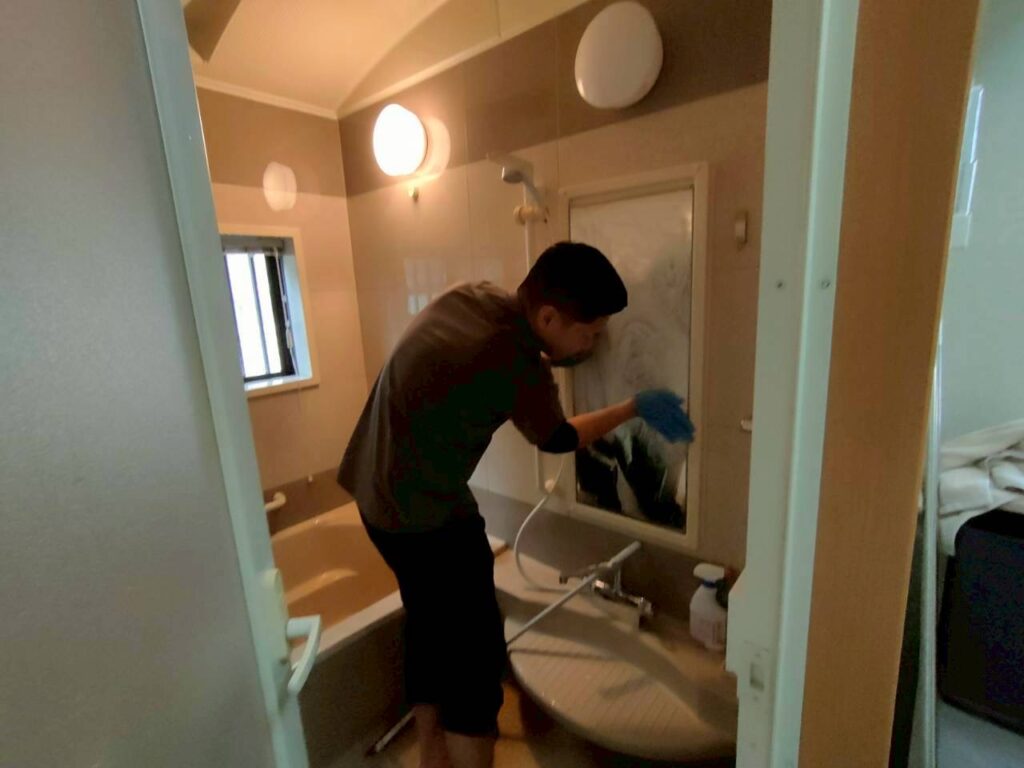 特殊な洗剤で、鏡の水垢を落としています。お掃除してても水垢は中々落ちないですからねー。